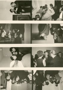 Ensemble de 8 petites photos en noir répartis sur 2 planches de 9 x 12,8 cm. Tirage d'époque (ca 1966). Photographies prises lors d'un vernissage, probablement à la Galerie Cogeime à Bruxelles, où l'on retrouve Marcel Broodthaers sur 3 d'entre-elles.
