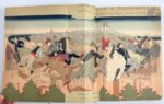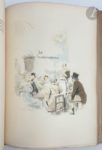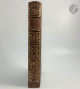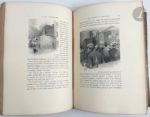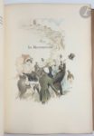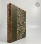 MONTORGUEIL (Georges) - VIDAL (Pierre). La Vie à Montmartre. Paris : G. Boudet, Ch. Tallandier, [1899]. — In-4, demi-maroquin vert olive à coins, filets dorés, dos à nerfs orné de motifs dorés et mosaïqués, tête dorée, non rogné, couverture et dos conservés (V. Champs). Édition originale tirée à 750 exemplaires, de cet ouvrage recherché tant pour son aspect documentaire qu'artistique sur Montmartre à la fin du XIXe siècle. Montorgueil y aborde toutes les facettes de ce lieu, en abordant tour à tour les thèmes suivants : Le vieux Montmartre. - Montmartre bâtit Montmartre. - La Montmartroise. - Montmartre politique. - Le Sacré-Cœur. - Pélerins et fidèles. - Les artistes. - Les cabarets pittoresques. - La chanson montmartroise. - Les forains de la butte. - Théâtres et tréteaux. - Les Moulins. - La Danse à Montmartre. - La veilleuse de nuit. - Les reposoirs galants. L'édition est illustrée de 150 lithographies de Pierre Vidal, dont une en couleurs couvrant les plats et le dos de la couverture, représentant la célèbre « vachalcade », un frontispice en couleurs, 15 faux titres en couleurs et 133 vignettes en noir dans le texte. Un des 700 exemplaires sur papier lithographique des Papeteries du Marais, fabriqué spécialement pour cet ouvrage, celui-ci enrichi d'une épreuve avant la lettre de la couverture, conservée d'un seul tenant, du prospectus de parution et de deux feuillets extraits de la « Bibliographie de la France », contenant la publicité pour l'ouvrage sur double page. Belle reliure mosaïquée de Victor Champs. Dos et bords des plats passés. Les feuillets de la « Bibliographie de la France » ont bruni la dernière page du prospectus et le feuillet de garde.