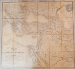 NOËL (A. D.) - VIVIEN DE SAINT-MARTIN (Louis) - PICQUET (Charles). Carte de l'Empire Ottoman Comprenant les Possessions de la Porte en Europe, en Asie, et en Afrique ; avec les Parties Limitrophes de l'Arabie, de la Perse, de la Russie et de l'Empire d'Autriche. Dressée par Noël et Vivien, Géographes ; Revue et Corrigée par Chles Picquet, géographe du roi et de Mgr le duc d'Orléans. Paris : Longuet, successeur de Simonneau, 1845. — Carte 1055 x 1139, entoilée et pliée, sous chemise et étui de l'éditeur. Très belle et grande carte en couleur de l'Empire ottoman. Exemplaire divisé en 24 sections montées sur toile, très bien conservé malgré quelques usures à l'étui.