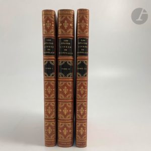 RABELAIS (François). Les Quatre livres de maistre François Rabelais suivis du Manuscrit du cinquième Livre publiés par les soins de MM. A. de Montaiglon et Louis Lacour. Paris : Académie des bibliophiles, 1868. — 3 volumes in-8, maroquin orange, triple filet doré en encadrement sur les plats, dos à nerfs orné, dentelle dorée intérieure, tranches dorées (Chambolle-Duru). Très belle édition imprimée par Jouaust et tirée à 525 exemplaires, parue dans la collection des Classiques français. UN DES 25 EXEMPLAIRES NUMÉROTÉS SUR PAPIER DE CHINE, enrichi des 11 planches gravées par Boilvin pour l'édition Jouaust de 1876 et de 15 des 16 eaux-fortes gravées par Bacquemond pour l'édition Lemerre de 1872, ces dernières accompagnées d'un feuillet avec la légende. Toutes sont en épreuve sur chine avant la lettre. Il manque à la série des Bracquemond la septième planche légendée « Comment Panurge feut amoureux d'une haulte dame de Paris ». Très bel exemplaire en reliure d Chambolle Duru. Petites taches noires sur les plats. Quelques rousseurs éparses. Provenance : Henri Bordes (1842-1911), avec ex-libris (vente 1911, n° 486). - Antoine Bordes, avec ex-libris.