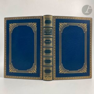 STAAL DE LAUNAY (Marguerite Jeanne Cordier, baronne de). Mémoires de Madame de Staal (Mademoiselle Delaunay). Paris : Librairie L. Conquet, 1891. — Grand in-8, maroquin bleu, double encadrement doré sur les plats, composés de roulettes, de filets droits et courbes et de feuillage aux angles, dos à nerfs orné, dentelle dorée intérieure, tranches dorées sur témoins, couverture et dos conservés (Chambolle-Duru). Belle édition de luxe tirée à 601 exemplaires, illustrée d'un portrait et de 30 vignettes (15 en-têtes et 15 culs-de-lampe), gravés par Léon Boisson d'après les compositions de C DELORT. Un des 400 exemplaires sur papier vélin du Marais comprenant un seul état des illustrations avec les noms des artistes en caractères romains. Splendide exemplaire relié par Chambolle-Duru, exceptionnellement enrichi de la suite des illustrations avant la lettre, dans laquelle figure également une épreuve des deux vignettes que l'on trouve normalement sur la couverture et sur le titre des 200 premiers exemplaires. Prospectus de parution relié à la fin. Dos très légèrement passé.