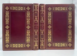 STENDHAL. La Chartreuse de Parme. Réimpression textuelle de l'édition originale. Préface de Francisque Sarcey. Paris : Librairie L. Conquet, 1883. — 2 volumes in-8, maroquin bordeaux à long grain, large encadrement composé de filets et fers dorés ainsi que d'une roulette à froid sur les plats, dos lisse orné, filets dorés et motifs dorés et à froid en encadrement à l'intérieur, doublures et gardes de soie brochée, doubles gardes, tranches dorées sur témoins, couverture conservée (E. Carayon). Belle édition tirée à 500 exemplaires, illustrée de 31 eaux-fortes originales de Valentin FOULQUIER (1822-1896), dont un frontispice, 28 têtes de chapitre et 2 culs-de-lampe. Le titre indique par erreur 32 gravures. Un des 150 premiers exemplaires sur japon, celui-ci faisant partie des 75 ne comprenant qu'un seul état des eaux-fortes. Très bel exemplaire en reliure de Carayon, enrichi du prospectus de parution.