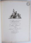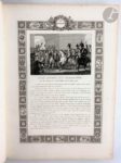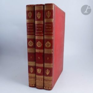TERNISIEN D'HAUDRICOURT (F.). Fastes de la Nation Française. Ouvrage présenté au roi et honoré de l'accueil flatteur de Sa Majesté ainsi que de la souscription des Empereurs, Rois, Princes, Ministres et principaux personnages de l'Europe. Paris : Decrouan, [1825]. — 3 volumes grand in-4, demi-maroquin à long grain, roulette dorée en encadrement sur les plats, dos lisse orné, tranches dorées (reliure de l'époque). Seconde édition augmentée de cet ouvrage paru pour la première fois entre 1804 et 1813. Ayant trait aux guerres qui ont suivi la Révolution de 1789 et aux campagnes de Napoléon, il avait pour ambition de « perpétuer la mémoire des hauts faits militaires, des traits de vertus civiques, ainsi que des exploits des membres de la légion d'honneur ». Imprimé sur papier vélin, il comprend trois titres gravés, trois frontispices identiques, et 214 planches gravées sur cuivre dont 208 comprenant une vignette d'après Martinet, Le Grand, Crépin, Lafitte, Swebach, etc., un texte explicatif et un bel encadrement allégorique, et six ne comprenant que du texte gravé, donnant la traduction en allemand des notices sur Frédéric roi de Wurtemberg, Marie Thérèse reine de Hongrie et de Bohême (2 planches), Maximilien Joseph roi de Bavière, G. F. A. de Polenz, et l'archiduc Charles Louis d'Autriche. L'édition originale ne comprenait pas d'encadrements. Très bel exemplaire en reliure de l'époque, complet des feuillets de texte imprimé comprenant les « Lettres des souverains, princes, ministres, et autres personnages illustres de l'Europe, adressées à M. Ternisien d'Haudricourt », ainsi que les tables des matières. Quelques griffures et frottements d'usage aux reliures, des coins légèrement émoussés. Tache d'encre sur le premier plat du volume 3. Rousseurs éparses.