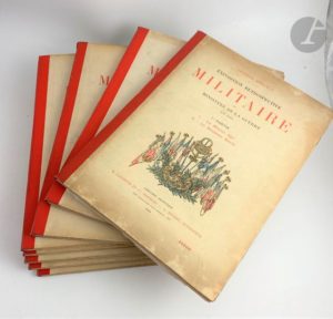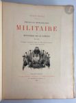 THOUMAS (Charles). Exposition rétrospective militaire du ministère de la guerre en 1889. Paris : Librairie artistique, H. Launette et Cie, G. Boudet, 1890. — 8 volumes in-folio, en feuilles, sous chemise cartonnée à lacets de l'éditeur. Édition originale de cet ouvrage du général Thoumas, prenant pour point d'appui l'Exposition rétrospective militaire qui s'est déroulée lors de l'exposition universelle de 1889 dans le pavillon élevé par le ministère de la guerre sur l'esplanade des Invalides. Il est illustré de plus de 400 reproductions par la photogravure de la plupart des objets exposés, dans le texte et hors texte. Le texte de Thoumas n'est pas un catalogue explicatif ni une histoire complète et méthodique de l'armée française. « C'est une sorte de galerie, dans laquelle à côté des biographies anecdotiques des personnages marquants, des épisodes intéressants se suivent dans l'ordre des temps, mais sans enchaînement logique, de manière à laisser dans l'esprit du lecteur, en ce qui concerne le passé militaire de la France, le sentiment des grandes lignes et la connaissance des détails caractéristiques » (p. XI). UN DES 15 EXEMPLAIRES SUR PAPIER DES MANUFACTURES IMPÉRIALES DU JAPON, CONTENANT UNE SUITE DE TOUTES LES PHOTOGRAVURES AVANT LA LETTRE. Usures et salissures aux chemises, sans les liens. Très bon état intérieur. La planche page 46, représentant les armes à feu portatives du XVIe siècle est sur chine collé sur papier vélin et présente des traces de pliures. Cette planche manquait visiblement dès l'origine puisqu'elle ne figure pas non plus dans la suite.