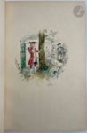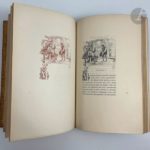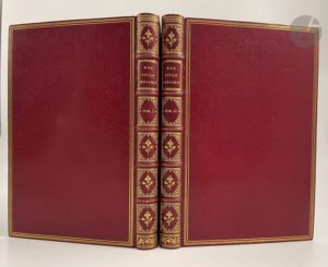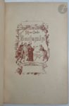 TILLIER (Claude). Mon oncle Benjamin. Avec une Préface par Monselet. Paris : Librairie L. Conquet, 1881. — 2 volume in-8, maroquin rouge, triple filet doré en encadrement sur les plats, dos à nerfs orné, dentelle dorée intérieure, tranches dorées, couverture et dos conservés (Cuzin). Nouvelle édition illustrée d'un portrait-frontispice et de 46 dessins de SAHIB gravés sur bois par Prunaire, dont 4 sur les couvertures. UN DES 50 PREMIERS EXEMPLAIRES NUMÉROTÉS SUR JAPON BLANC. Il est enrichi d'une aquarelle originale de l'artiste à pleine page et d'une suite des illustrations en sanguine avant la lettre. Très bel exemplaire relié par Cuzin. Provenance : André Sciama, connu également sous le pseudonyme d'Albert Semiane, avec son ex-libris.