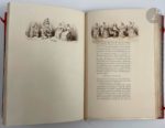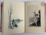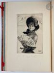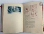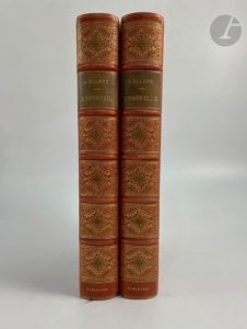 UZANNE (Octave). L’Éventail. — L’Ombrelle. Le gant - Le manchon. Paris : A. Quentin, 1882-1883. — 2 ouvrages en 2 volumes in-8, demi-maroquin orange à coins, filets dorés, dos à nerfs orné motifs dorés et mosaïqués, tête dorée, non rogné, couvertures conservées, étui (reliure de l'époque). Édition originale de ces deux ouvrages destinés notamment à retracer l’histoire des principaux accessoires de la toilette féminine, chacun illustré de nombreuses compositions de Paul Avril. Exemplaires sur papier vélin fort, montés sur onglets, enrichis d'une suite des illustrations sur japon. Ils comportent également chacun la couverture imprimée sur soie destinée à l’étui, complète des rubans rouges, ainsi que celle de l'ouvrage imprimée sur japon. Très bel exemplaire, joliment relié à l'époque pour Eugène Vierne, avec son super libris sur le premier plat et enrichi d'une eau-forte originale de Henry Somm dédicacée en tête de « L'Éventail » : « Offert à Monsieur Eugène Vierne. Henry Somm. » Dos légèrement passés. Transfert de certaines illustrations sur les feuillets en regard.