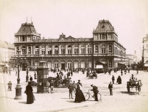 Ensemble de 3 tirages albuminés (ca 1895). Vues de la gare du Nord, de la place de Brouckère et de la Bourse. Dim. : (3 x) 21 x 27 cm.