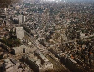 Ensemble de 3 photos aériennes originales en couleurs de Bruxelles (ca 1990) : 1. Abbaye de la Cambre, les étangs d'Ixelles et l'avenue Louise vers le Palais de Justice (dim. : 54,5 x 71 cm).- 2. Palais de Justice, place Louise, avenue de la Toison d'Or et la Porte de Namur (dim. : 54,5 x 71 cm).- 3. Gare du quartier Léopold avant la construction du Parlement européen (dim. : 24 x 17,5 cm).