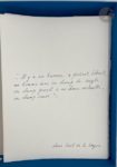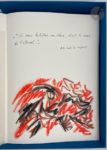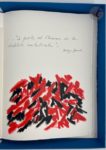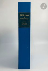 CHAR (René) - DUMONT (Marcel). Un homme debout. Chateaurenard : Marcel Dumont, 1990. — In-folio, en feuilles, couverture rempliée, emboîtage en toile bleue. Livre unique entièrement calligraphié et illustré par l'artiste Marcel DUMONT (1921-1998), peintre considéré comme l'un des grands maîtres de l'abstraction lyrique, apprécié de Jean Bazaine, de Cocteau ou encore de François Cheng. Réalisé au printemps 1990 sur papier vélin de Rives, il comprend le texte manuscrit accompagné de 24 ŒUVRES ORIGINALES EN COULEURS DE L'ARTISTE, non signées, dont 3 sur double page. Il est joint des photocopies de lettres de Marcel Dumont, une correspondance de la famille de l'artiste, ainsi qu'une affiche et une brochure publiées en 2002 pour l'exposition des peintures et dessins de Dumont à la galerie J. E. Bernard à Avignon et à la galerie espace culturel de Chateaurenard. Provenance : succession Marcel Dumont (vente 1998, Avignon, n° 141). - Jean Arquinet.