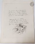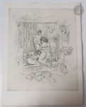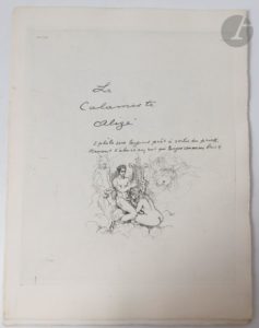 [CURIOSA] - GONZAGUE FRICK (Louis de) - BROUET (Auguste). Le Calamiste Alizé. In-folio, en feuilles, couverture rempliée. Édition très rare, de ce recueil de poèmes de Louis de Gonzague Frick, entièrement gravée et illustrée par Auguste Brouet. Le texte reproduit l'écriture manuscrite de l'auteur. Brouet y a composé onze eaux-fortes libres dont une à pleine page entourée de remarques formant un véritable cadre historié. Cette édition n'est pas citée par Dutel qui recense 2 éditions in-8 et une in-4. Elle fut publiée après 1940 à 50 exemplaires sur papier vélin de Rives. Exemplaire complet des treize planches mais il manque le feuillet de justification.