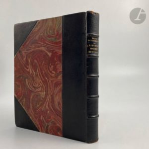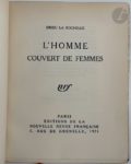 DRIEU LA ROCHELLE (Pierre). L'Homme couvert de femmes. Paris : Nouvelle Revue Française, 1925. — In-4, demi-chagrin brun foncé à coins, dos à nerfs, tête dorée, non rogné, couverture et dos conservés (reliure de la fin du XXe siècle) Édition originale. Un des 109 premiers exemplaires in-4 tellière sur papier vergé pur fil Lafuma-Navarre, celui-ci faisant partie des 100 réservés aux bibliophiles de la Nouvelle Revue Française, spécialement imprimé pour Eugène-Claude Mongermon. Accrocs et manques à la coiffe de tête, légères craquelures aux charnières, gardes renouvelées.