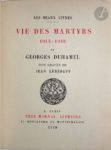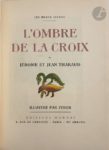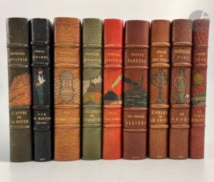 [LIVRES ILLUSTRÉS]. Ensemble de 9 ouvrages illustrés du début du XXe siècle, reliés dans le même esprit en demi-maroquin à coins orné au dos d'un décor mosaïqué se rapportant à chacun des livres. Paris, 1919-1933. — 9 volumes in-8, demi-maroquin à coins, de teintes différentes, filets dorés, dos à nerfs orné au centre d'un décor mosaïqué, tête dorée, non rogné, couverture et dos conservés (Franz, Trinckvel). Comprend : - CRÉBILLON FILS. Le Sopha. Illustrations de CARLÈGLE. Paris : Mornay, 1933. — Demi-maroquin grenat à coins de Franz. 1/980 exemplaires sur papier de Rives. Dos passé. - DUHAMEL (Georges). Vie des martyrs. 1914-1916. Bois gravés de Jean LÉBÉDEFF. Paris : Mornay, 1919. — Demi-maroquin noir à coins de Franz. 1/50 EXEMPLAIRES SUR JAPON IMPÉRIAL. - ESTAUNIÉ (Édouard). L'Appel de la route. Illustrations de Pierre ROUSSEAU. Paris : Henri Cyraln, 1928. — Demi-maroquin anthracite à coins de Franz. 1/970 exemplaires sur vélin de Rives. Dos passé. - ESTAUNIÉ (Édouard). L'Ascension de M. Baslèvre. Roman. Illustrations de Pierre ROUSSEAU. Paris : Henri Cyraln, 1926. — Demi-maroquin vert à coins de Franz. 1/980 exemplaires sur vélin de Rives. Dos passé. - ESTAUNIÉ (Édouard). Les Choses voient. Illustrations de F. de MARLIAVE. Paris : Henri Cyral, 1931. — Demi-maroquin havane à coins de Franz. 1/961 exemplaires sur vélin de Rives. Dos passé. - ESTAUNIÉ (Édouard). Tels qu'ils furent. Roman. Illustrations de Pierre LISSAC. Paris : Henri Cyral, 1929. — Demi-maroquin rouge orangé à coins de Franz. 1/970 exemplaires sur vélin de Rives. Dos passé. - FARRÈRE (Claude). Les Petites alliées. Roman. Illustrations en couleurs de Jean Dulac. Paris : L'Atelier du livre, 1932. — Demi-maroquin marron à coin de Trinckvel. 1/1800 exemplaires sur vélin blanc. Dos passé. Provenance : André Monal, avec ex-libris. - GIDE (André). La Porte étroite. Illustrations de DANIEL-GIRARD. Paris : Henri Cyral, 1925. — Demi-maroquin grenat à coins de Franz. 1/1000 exemplaires sur vélin de Rives. Dos passé. - THARAUD (Jérôme et Jean). L'Ombre de la croix. Illustré par FEDER. Paris : Mornay, 1932. — Demi-maroquin brique à coins de Franz. 1/589 exemplaires sur papier de Rives. Dos passé.