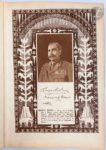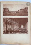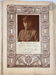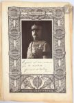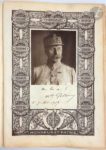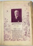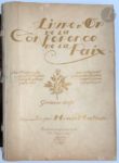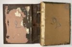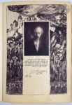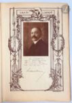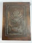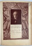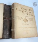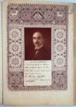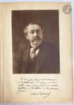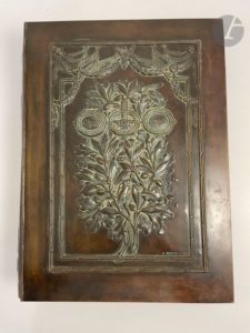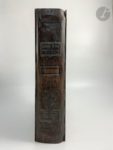 MARTINIE (Henri). Livre d'Or de la Conférence de la Paix. Les Portraits, autographes, biographies, pensées des délégués plénipotentiaires, secrétaires généraux, Grands chefs, Recueillis par Henri Martinie. Paris : Édition originale d'art, H. Martinie, 1921. — In-folio, reliure en métal repoussé, ornée sur le premier plat d'un encadrement et au centre de feuilles de chêne avec une épée et deux médaillons avec les dates 1914-1918, et sur le second plat d'un levé ou d'un coucher de soleil portant la date de 1920, dans un double cadre, dos lisse orné d'un décor de feuilles d'olivier, doublures et gardes de soir moirée verte et rayée de rouge (G. Perrin). Ouvrage commémoratif d'une très grande rareté, conçu et publié par le critique d'art Henri Martinie (1881-1963), célébrant la conférence de la paix qui réunit en 1919 et 1920 les alliés victorieux de la première guerre mondiale et dont le principal résultat fut le Traité de Versailles signé le 28 juin 1919 et promulgué le 10 janvier 1920. Il s'agit vraisemblablement d'une pièce unique, aucun exemplaire ne figurant dans les bibliothèques publiques et sur le marché. Il se compose d'un titre, d'un feuillet évoquant les artistes ayant contribué à l'ouvrage, et 50 feuillets sur lesquels figurent la photographie des protagonistes français et étrangers, des lieux où siégeaient les différentes délégations, le fac-similé de 5 exemplaires de la ratification du traité de Versailles, et 3 planches reproduisant des dessins de Cass Papazian, Hepworth et Georges Scott. On compte au total 35 photographies au charbon de Pigmenta, soit 28 portraits du photographe Isabey représentant Aristide Briand, René Viviani, Alexandre Millerand, Robert Lansing, lord Robert Cécil, Ganga Singh, André Tardieu, Louis Loucheur, Silvio Crespi, le marquis Kimmochi Saionji, Paul Hymans, Ignace Paderewski, Octavio Rodrigo, Edouard Benes, Constantin Coanda, Elefthérios Venizélos, Nicolas Pachitch, Rustam Haidar, le prince Charoon, Jean-Antoine Buero, Norton de Mattos, Ferdinand Foch, Philippe Pétain, Hubert Lyautey, Émile Fayolle, Louis François Félix Marie Franhet d'Espèrey, Pierre-Alexis-Marie-Antoine Ronarch, et Jean Marie Joseph Degoutte. À cela s'ajoutent les photographies de l'hôtel Crillon (délégation des États-Unis d'Amérique), de l'hôtel Majestic (délégation britannique), de l'hôtel Édouard VII (délégation italienne), de l'hôtel Bristol (délégation japonaise), de l'hôtel Lotti (délégation belge), de l'hôtel Plazza Athénée (délégation des États-Unis du Brésil), et de l'hôtel Lutetia (délégation Tchéco-Slovaque). Un feuillet comprend la photographie de la pile des traités et un autre la reproduction d'une photographie du château de Versailles et de celle de la galerie des glaces. La plupart de ces photographies sont comprises dans un encadrement gravé d'après un artiste originaire de la nation représentée. Ainsi figurent les noms d'Adolphe Giraldon, de Henri de Groux, de Galanis, de Severini, de Yeremitch, etc. ainsi que de Léonard FOUJITA qui a réalisé deux encadrements différents, le premier étant répété une fois. Tous ces feuillets sont suivis de plus d'un centaine d'autres vierges. L'ensemble a été relié dans une reliure en métal repoussé, signée G. Perrin. Il semble que cet exemplaire soit resté inachevé car en tête est annoncée une préface de Louis Barthou qui n'y figure pas. Exemplaire dérelié. Rousseurs éparses et quelques salissures.