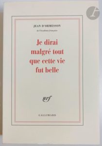 ORMESSON (Jean d'). Ensemble de 3 ouvrages : - GUIDE DES ÉGARÉS. Paris : Gallimard, Héloïse d'Ormesson, [2016]. — In-12, broché, couverture rempliée. Édition originale. Un des 90 exemplaires numérotés sur vélin Rivoli des papeteries Arjowiggins, seul tirage sur grand papier. - JE DIRAI MALGRÉ TOUT QUE CETTE VIE FUT BELLE. Paris : Gallimard, [2016]. — In-8, broché, couverture rempliée. Édition originale. Un des 90 exemplaires numérotés sur vélin Rivoli des papeteries Arjowiggins, seul tirage sur grand papier, enrichi d'un envoi autographe signé de l'auteur. Coupures de magazine jointes. - ET MOI, JE VIS TOUJOURS. Roman. Paris : Gallimard, [2017]. — In-8, broché, couverture rempliée. Édition originale. Un des 160 exemplaires numérotés sur vélin Rivoli des papeteries Arjowiggins, seul tirage sur grand papier.