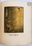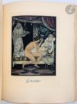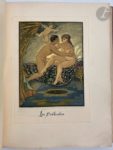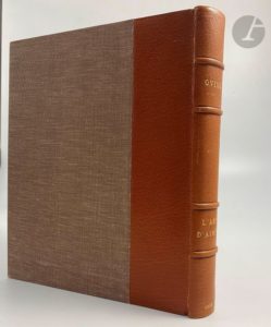 OVIDE. L'Art d'aimer. Traduction nouvelle de Pierre Lièvre. Paris : G. et R. Briffaut, 1923. — In-4, demi-maroquin orange, dos à nerfs, tête dorée, non rogné, couverture et dos conservés (reliure moderne). Très belle édition de « L'Art d'aimer » d'Ovide, dans la nouvelle traduction de Pierre Lièvre. Elle est illustrée par le graveur et illustrateur suisse André Lambert (1884-1967) de 23 compositions en couleurs, gravées à l'eau-forte, dont un titre, 4 frontispices et 18 hors-texte, ainsi que quelques lettrines et ornements gravés sur bois. Tirage à 500 exemplaires ; un des 404 sur vélin d'Arches au filigrane de la collection, contenant l'état définitif en couleurs de toutes les planches. Dos légèrement passé et quelques petits frottements d'usage. Tache sur le bord inférieur de plusieurs feuillets et quelques rares piqûres sans gravité.