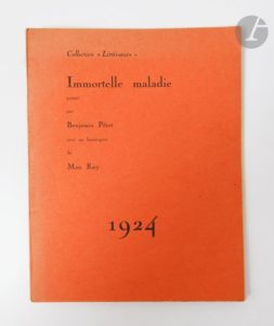PÉRET (Benjamin). Immortelle maladie. [Paris] : Collection « Littérature », 1924. — In-8, broché. Édition originale tirée à 201 exemplaires, illustrée d'une composition en noir de Man Ray, reproduite en frontispice. Un des 120 exemplaires sur vélin, très bien conservé.
