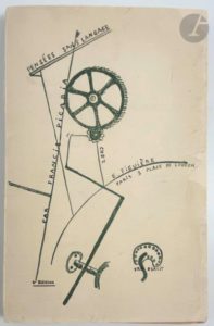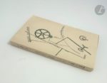 PICABIA (Francis). Pensées sans langage. Poème. Précédé d'une préface par Udnie. Paris : Eugène Figuière, 1919. — In-12, broché. Édition originale dont il n'a pas été tiré d'exemplaires sur grand papier. Elle comporte sur la couverture une composition « mécanique » de l'auteur. Exemplaire avec mention fictive de « 4e Edition » sur le premier plat de la couverture. Couverture doublée et restaurée, dos rapporté. Deux déchirures avec manque mais sans atteinte au dessin, sur le bord du premier plat.