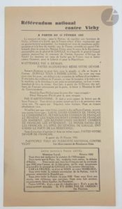 [RÉSISTANCE]. Référendum national contre Vichy. À partir du 15 février 1943. Tract 282 x 153, imprimé au recto. Ce tract publié par les Mouvements de Résistance Unis fut visiblement imprimé en même temps que le numéro 23 du 1er février 1943 du journal « Libération ». Il reproduit strictement la première colonne du journal, se terminant par la « Lettre ouverte à Pierre Laval » que les rédacteurs demandent de recopier et d'envoyer le plus massivement possible à Laval. Exemplaire parfaitement conservé.