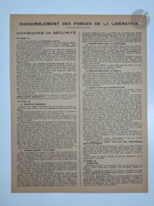 [RÉSISTANCE]. Rassemblement des forces de la Libération. Consignes de sécurité. Tract 270 x 208, imprimé au recto. Intéressant et rare tract donnant les consignes de sécurité destinées aux résistants face à la répression accrue tant de la part de Vichy que de la Gestapo. Ce document n'est pas daté et daterait de fin 1943 ou début 1944. Exemplaire parfaitement conservé.