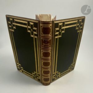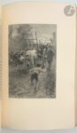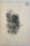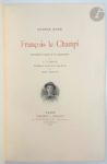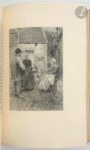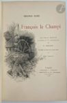 SAND (George). François le Champi. Paris : Librairie L. Conquet, 1905. — In-8, maroquin vert foncé, filets dorés droits et entrelacés aux angles en encadrement sur les plats, dos à nerfs orné, neuf filets dorés intérieurs, tranches dorées sur témoins, couverture et dos conservés (Chambolle-Duru). Édition de luxe particulièrement belle, tirée à 301 exemplaires et illustrée de 33 compositions d'Alcide RBAUDI, gravées au burin et à l'eau-forte par Henri Manesse, dont 26 hors texte, 2 sur la couverture, les autres en tête de chapitre ou en cul-de-lampe. Le titre n'indique que 31 compositions. Un des 100 premiers exemplaires sur japon ou vélin du Marais, celui-ci sur vélin faisant partie des 70 comprenant deux états des illustrations, définitif et avant la lettre. Très bel exemplaire relié par Chambolle-Duru, enrichi du prospectus de parution. Dos passé. Provenance : ex-libris armorié.
