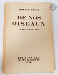 TZARA (Tristan). De nos oiseaux. Poèmes. Paris : Éditions Kra, [1929]. — In-12, broché. Édition originale illustrée de 10 compositions à pleine page de Jean ARP. Exemplaire du tirage courant, après seulement 20 exemplaires sur grands papiers. Légères salissures à la couverture.