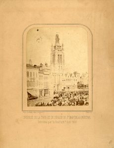 "Incendie de la tour et de l'église de St-Martin, à Courtrai, détruites par la foudre, le 7 août 1862". Ensemble de 3 tirages albuminés d'époque, collés en plein sur carton fort (carton légendé). Dim. carton : (3 x) 15 x 11,5 cm ; support et sujet : (3 x) 8 x 6 cm. Avec ces documents "déposés", Auguste De Bedts réalise un des premiers - si pas le premier - reportage photographique belge (S.F. Joseph, T. Schwilden, M.-C. Claes. Directory of Photographers in Belgium 1839-1905, p. 107).