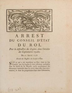 13- [CAPITAINERIES]. - Arrest du Conseil d'État du Roi, pour la destruction des lapins, dans l'étendue des capitaineries royales. Du 21 janvier 1776. Paris, Imprimerie royale, 1776, in-4, 7 pp. "Sur ce qui a été représenté au Roi, étant en son Conseil, que les lapins se sont tellement multipliés dans les forêts de Sa Majesté, qu'ils occasionnent des dommages immenses dans les terres dont elles sont environnées (...)". Thiébaud, 149-150 (édition de P.-G. Simon).