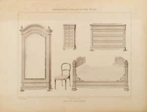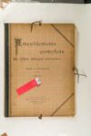 106- BERTIN (Louis), COMPAGNON (L.). Ameublements complets de tous styles. Première [- Deuxième] série. Dourdan, Émile Thézard fils, s.d., 2 vol. in-folio, en feuilles sous chemises demi-toile chagrinées vertes à lacets, dos lisses muets, plats de cartonnage fantaisie, titre poussé sur les plats supérieurs Dos de la première série renforcé. Deux premières séries sur quatre. 60 planches en héliotypie. Louis Bertin était dessinateur spécial en menuiserie, et ancien chef d'atelier. SONT JOINTES : 3 planches de la série Documents pratiques d'ameublement, parue chez le même éditeur (les numéros 3, 13 et 23).