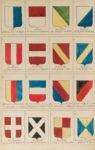 149- [HERALDIQUE] - [ DANGEAU (Louis Courcillon de)]. Principes du blason en quatorze planches, qui traitent : La Ière des émaus, II. Des hachures, III. Des partitions & des pièces honorables. IV. Suite des pièces honorables, avec les pièces honorables diminuées. V. Des pièces honorables multipliées. VI. Des difèrantes sortes de crois. VII. Des pièces qu'on ne nome point pièces honorables. VIII. Des animaus à quatres piés. IX. Des oiseaus. X. Des atributs des pièces. XI. Des pièces chargées. XII. Des pièces acompagnées. XIII. Des parties séparées du cors des animaus. XIV. Des brisures & des partitions qui servent à mètre plusieurs armoiries dans le même écu. Chacune de ces planches est accompagnée d'une explication. Paris, Grégoire Dupuis, 1711, in-folio, [3 demi-toile fantaisie, pièce de titre cerise, plats de cartonnage de papier bouquet (reliure du XIXe siècle). Coiffes et coins abîmés, galerie de vers aux premiers ff., avec pertes de lettres, réparation maladroite de papier au f. 7-8. Seconde édition, tout aussi rare que la première. 28 planches héraldiques hors texte, dont 13 aux blasons aquarellés. Chaque planche est double.