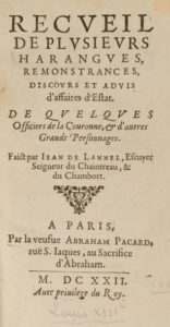 169- LANNEL (Jean de). Recueil de plusieurs harangues, remonstrances, discours et advis d'affaires …