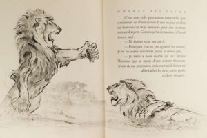 238- DEMAISON (André). Ombres des dieux. La comédie animale. [Boulogne-sur-Seine], Aux dépens d'amateurs, 1955, in-folio, en feuilles, sous couverture rempliée, avec chemise et étui. Illustré de 23 gravures originales d'Odette Denis (dont la couverture) sur cuivre en noir dont 18 a? double page. Illustrations par Maurel et Rigal. Tirage à 165 exemplaires, celui-ci (n° 58) est un des 35 sur vélin du Marais contenant une suite supplémentaire des illustrations sur Johannot, avec remarques. Quelques rousseurs.