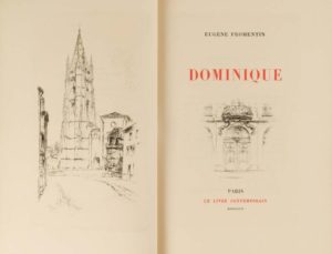 242- FROMENTIN (Eugène). Dominique. Paris, Le livre contemporain, 1905, in-8, demi-chagrin orange à bandes, dos lisse orne? d'une fleur dorée, couvertures et dos conservés, sous étui assorti (Rameau). Illustré de 40 eaux-fortes de Gustave Leheutre dont un frontispice et de nombreux en-têtes et cul- de-lampe représentant des paysages des villes de Saintes et de la Rochelle pour la plupart. Tirage à 117 exemplaires sur vergé d'Arches, celui-ci n°54, spécialement imprimé pour M. Lavallette-Simon.