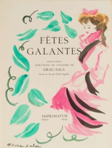 271- VERLAINE (Paul). Fêtes galantes. Paris et Nice, 1953, in-4, en feuilles, sous chemise et etui légèrement fatigués. Illustré de 22 hors-texte en couleurs de Grau-Sala gravés sur bois par Angiolini, et d'une aquarelle originale signée sur la page de titre. Tirage à 350 exemplaires numérotés, celui-ci est 1 des quelques exemplaires d'artiste réservés aux collaborateurs de l'édition, signé par Grau-Sala.