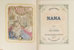 276- ZOLA (Emile). Nana. Paris, Henri Jonquières, 1929, 2 volumes in-4, maroquin grenat à gros grains, illustrés d'un décor doré représentant un intérieur feutré avec au centre du plat, une fenêtre mosaïquée en maroquin turquoise, dos lisses passés, ornés du titre et de cercles entrelacés dorés, têtes dorées, couvertures et dos conservés, sous étui. (Michel Kieffer). Édition illustrée de 43 eaux-fortes en couleurs de Chas Laborde dont 17 à pleine page. 1/170 exemplaires numérotés sur vélin de pur chiffon de Paviot, avec une suite en noir reliée en fin d'ouvrage. Infimes décharges de certaines illustrations.