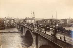 Ensemble de 9 tirages albuminés d'époque, titrés, numérotés, monogrammés et collés en plein sur carton (ca 1890). Vues du London Bridge surencombré, de Rotten Row à Hyde Park, de Trafalgar Square, du parlement et de l'abbaye à Westminster, de la cathédrale Saint-Paul, du Palais de Justice, de la Tour de Londres et du château de Windsor. Dim. : (9 x) +/- 19 x 29 cm.