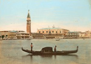 "Ricordo di Venezia". Album comportant 18 tirages albuminés d'après des négatifs sur verre au collodion, colorisés manuellement à l'aniline. Format cabinet (9,7 x 13,5 cm). Photos collées en plein sur carton, monté sur onglet dans un album en pleine percaline bleue (titrée et dorée au plat supér.). Installé à Venise comme photographe et menuisier en 1854, Paolo Salviati (1818-1894) met au point un procédé de coloriage à l'aniline pour donner plus de vie et de réalité à chaque document.
