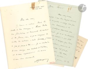 AVIATION. André BLAIGNAN (1890-1968) pilote de la guerre 14-18. L.A.S., Aix-les-Bains 12 janvier 1916, à Jacques Mortane ; 16 pages in-8. Après son accident, il rassemble ses souvenirs sur le début de la guerre, à Dijon, puis Belfort, où il retrouvé ses anciens camarades : Caron, Sadi Lecointe… Il dresse la liste des camarades tués ou prisonniers. Puis il raconte l’affaire du camp de Châlons, où il est allé chercher un appareil Blériot (biplace 80 Hp) ; mais celui-ci a été détruit avant son arrivée, les Boches étant à Mourmelon. Il repart, laissant les appareils qui ont été sabotés… Etc.