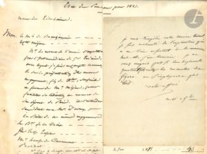 Eugène de BEAUHARNAIS (1781-1824) fils de l’Impératrice Joséphine, Vice-Roi d’Italie. L.A., ce 28 [décembre 1820 ?, à Étienne Soulange-Bodin] et P.A. de ce dernier, Pensions, 1821 ; titre et 6 pages in-fol. (lég.mouillure). On joint 28 lettres et documents « Je vous réexpédie votre dernier travail. Je suis enchanté de l’explication qui a eu lieu et surtout de la manière dont elle s’est terminée. Je ne vous croyais pas si bon diplomate. Pourtant faites éviter les rencontres de Figaro. On s’expliquera plus tard »… Soulange-Bodin a dressé l’« État des Pensions pour 1821 », avec les titulaires, le montant, les sommes payées ou restant à payer. Les premiers titulaires sont le marquis de Beauharnais, le comte Méjan, Rose Tascher… Il est noté : « Le restant de l’année s’acquittera par l’intermédiaire du Gal Triaire, avec lequel je suis en compte courant, & sur la présentation de mon engagement, fin de Xbre, souscrit en faveur de Mr Méjan, pour faciliter sa libération au moment de son départ de Paris. Il s’entendra sans doute avec Mr D’Arnay, pour la suite de ces mêmes engagemens »… On joint 28 lettres et documents, 1821-1828, concernant le décès du Prince Eugène, sa succession, les biens et les intérêts financiers de la maison ducale de Leuchtenberg : minutes de lettres, lettres et documents de Louis Eisenmenger, le baron d’Arnay, Soulange-Bodin, et une longue note « sur la réclamation de M. Duveyrier contre le Prince Eugène…