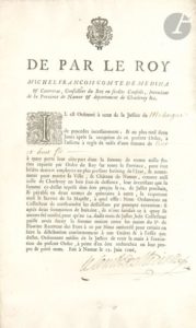 BELGIQUE. 3 pièces sur parchemin, dont un avec sceaux pendants, 1513-1656, et 8 P.S. en partie imprimées avec en-tête et quelques vignettes, 1706-1793 ; in-fol. Acquêts à Namur (1513) et à Dhuys (1656) ; arrentement d’une maison et ses terres à Dhuys (1520). Ordres signés par des intendants de Namur : comte de Medina (3, 1706), comte de Lannoy de Clervaux (1720 et 1725), Jamblinne de Neuville (1746), prince de Gavre (1767).