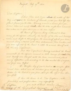 Simon BERNARD (1779-1839) général et ingénieur, il réalisa de grands travaux aux États-Unis, et fut ministre de la Guerre. 2 L.S. comme brigadier général, membre du « Board of Engineers » (Commission des ingénieurs), New York 1822, à des officiers américains ; 1 page in-4 chaque ; en anglais. Sur ses travaux topographiques et la défense des côtes aux États-Unis. 27 juillet, au capitaine Hugh Young, du corps des Ingénieurs topographes (Topographical Engineers), à Pensacola (Floride). Elle concerne les relevés topographiques des fleuves Ohio et Mississippi que Simon effectue avec le colonel Totten, tous deux membres de Commission des ingénieurs. Pour régler les dépenses occasionnées par ces travaux, celle-ci a tiré des traites sur le Treasury Department en désignant le capitaine Young comme bénéficiaire. Mais les comptes n’étant pas encore soldés avec le Trésor, celui-ci vient de bloquer les salaires des deux ingénieurs, qui demandent à Young de leur adresser les quittances correspondant aux sommes qu’il a reçues... 1er décembre, au major général A. Macomb, Chief Engineer, à Washington : « I have the honor to report to you that last month the Board were engaged in the projects for the defence of the coasts of Massachusetts »...