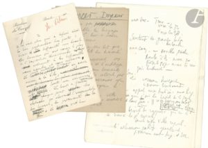 Léon BLUM. 3 manuscrits autographes ; 10 pages in-8 et 9 pages in-4, avec ratures et corrections. On joint un fort dossier de tapuscrits Brouillon de discours sur le Front populaire (Clermont-Ferrand 1935 ? ; 9 p. in-4 au crayon, en-tête Chambre des députés). « Pas appel aux soc. Tous […] Sentent la gravité de la bataille. Pas appel aux com. – Double pacte […] Front Pop. avec ts ceux qui luttent. […] Le serment. Le Front Pop. ne risque rien […] Nos titres 12 Février Doumergue Font Pop. Prêts partout »… Etc. Exercer-Imposer, brouillon de discours à la Chambre, [1936] (8 p. in-8 au crayon). « La Ch. n’a pas oublié le langage que le gouvt lui a tenu samedi dernier. Ns lui avons dit que, dans les conflits du travail le gouvt assumerait son rôle d’entremise et d’arbitrage. Ns lui avons demandé de fortifier notre volonté par sa volonté souveraine afin [que] le gouvt put imposer l’autorité. […] Gouv. c’est prévoir. Oui mai c’est aussi se mettre francht en face des difficulté présentes et de la réalité immédiate ». Sur l’Exposition universelle de 1937 (2 p. in-8 à en-tête Présidence du Conseil) : « Les hommes qui ont conçu le plan de l’Exposition Universelle s’étaient astreints à des difficultés sans nombre et sans mesure. Ils ont entrepris d’ériger au cœur même de la Ville, toute une immense cité neuve »... On joint un fort dossier de tapuscrits : discours, conférences, déclarations, doubles de lettres à Daladier, doubles de notes remises à Blum par J. Rueff ou M. Rucart, etc. ; plus des journaux et coupures de presse.