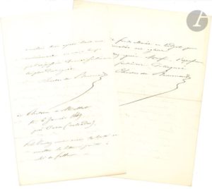 Charles, comte de BOURMONT (1807-1876) page de Charles x et officier, fils du maréchal. 6 L.A.S., château Maltot et Caen janvier-juin 1849, à Charles Jourdain ; 15 pages in-4 ou in-8. Sur la répression des émeutes de Rouen en 1849 et le renvoi de Guadeloupe de l’abbé Dugoujon, anti-esclavagiste. 26 janvier. « Je parlais hier dans ma lettre à M. de Falloux de la droiture et de l’énergie qu’avait montré Me Blanche dans le procès des insurgés de Rouen, où il s’était chargé de défendre un des prévenus M. Dubreuil contre lequel l’accusation a été abandonnée ». Il signale Douche, chef de bataillon de la Garde nationale de Rouen, « à l’énergie duquel la Ville de Rouen doit surtout d’avoir vu l’Hôtel de Ville préservé dans les funestes journées de mois d’avril dernier »… – 28 janvier, au sujet d’ un secours pour l’abbé Fleury, chanoine de la cathédrale de Coutances », et les nouvelles peu rassurantes de Paris : « On parle de nombreux rassemblemens et de projets d’émeutes à propos de la loi sur les clubs. Dieu veuille que ces projets des anarchistes viennent à échouer ! Si la lutte s’engage, que la vigueur de la république soit mesurée au mal que ces perturbateurs au repos public font à la France ! c’est le vœu général autour de nous ».. – 25 mars, sur les graves événements survenus aux Antilles : « ils doivent malheureusement amener M. le ministre des cultes à pourvoir au remplacement de l’abbé de Goujeon [Dugoujon] comme vicaire apostolique » ; il recommande l’abbé Guyard pour lui succéder. Il intervient en faveur de l’architecte Verrolles, qui dirigeait la restauration de la cathédrale de Bayeux… – 20 juin, au sujet de la reconstruction de l’église de Villers-Bocage. Etc.