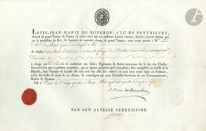 CHASSE. P.S. par Louis-Jean-Marie de Bourbon, duc de PENTHIÈVRE (1725-1793), Amiral et grand Veneur de France, Paris 24 août 1787 ; 1 page oblong in-fol. en partie impr., vignette et cachet de cire rouge à ses armes. Permis de chasse pour le chevalier de Briel, garde du corps du Roi, pour chasser « dans toute l’étendue du ban et finage de Moutier sur Sceaux, accompagné d’un ami ».