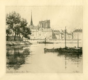 "Notre-Dame et le Quai aux fleurs" (1921). Eau-forte en noir, titrée, datée et signée dans la planche, contresignée au crayon et montée sous passe-partout et cadre en bois. Dim. cadre : 41 x 42,5 cm ; sujet : 21 x 23 cm.