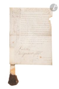 LOUIS XIV. P.S. (secrétaire), Versailles 18 décembre 1700 ; contresignée par Phelypeaux et Chamillart ; cahier de parchemin in-4 de 15 pages, reste de sceau de cire brune pendant sur queue (un peu rongé sur un bord). Lettres patentes pour l’établissement d’un marché de bœufs et autres bestiaux à Poissy.