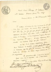 LOUIS-PHILIPPE (1773-1850). 2 P.S. « Louis Philippe d’Orléans » avec apostilles autographes, Palais-Royal 1829-1830 ; 1 page in-4 chaque avec timbre fiscal. 25 avril 1829. Pouvoir à son avoué Denormandie d’enchérir pour lui à l’adjudication d’onze arcades du Palais-Royal. – Avril 1830, pouvoir au même pour l’enchère de la forêt de Montauban (Ille-et-Vilaine) ; signé aussi par Marie-Amélie, et leur secrétaire des commandements Oudard.