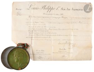 LOUIS-PHILIPPE. P.S., Palais de St Cloud 25 septembre 1846 ; contresigné (2 fois) par le Garde des Sceaux H. Martin du Nord ; vélin in-plano en partie impr., grand sceau de cire verte pendant sur rubans rouge et vert à l’effigie royale dans on boîtier métallique. Autorisation donnée à Auguste-Jules Bourgne, de Paris, veuf, de se remarier avec sa belle-sœur Mlle Gabrielle Emma Ledier.