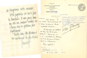 [Hubert LYAUTEY (1854-1934) maréchal]. Dossier de lettres et documents autour de Lyautey et de son centenaire. Correspondances de ou adressées à Hubert Lyautey, Pierre Deloncle (délégué général du Centenaire), André Dubois (secrétaire de l’Exposition Coloniale) ou Pierre Lyautey, ou entre eux. Environ 50 lettres : comtesse de Bertier (6), J. Bollery, Pierre Deloncle, R.L. Fourcade, Franchet d’Espèrey, J. Hébertot, Gabriel Hanotaux (longue lettre sur Reims et le cardinal Luçon), Pierre Henriot (8), Henri-Robert, M.F.C. Honoré, H. de Jouvenel (5), Pierre Lyautey (50, certaines à son oncle), Louis Madelin, L. de Mondésir, Lucien Paulot, Louise Pommery, Jean Thiry, etc. Important ensemble de doubles de lettres dactylographiées, tapuscrits d’articles, discours ou rapports, notamment sur Lyautey et sur le Maroc ; brochures sur Lyautey, scénario du film Lyautey le Grand de Denys de La Patellière ; brochures et tracts de propagande (1939-1945) ; etc.