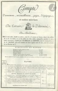 MARINE. P.S. par les armateurs « Belly & Lefort », Bordeaux 5 ventôse VII (23 février 1799) ; cahier imprimé in-fol. de 6 ff.. Corsaire Le Déterminé de Bordeaux, Armateurs J.B. Belly & Lefort, Capitaine J Danet : Compte d’armement, avictuaillement, gages d’équipage et entière mise-hors du Corsaire Le Déterminé.