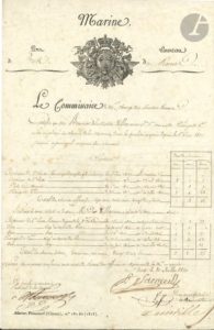 MARINE. 21 L.S. ou P.S. à Jacques-François-Marie-Achille Bouvier de La Motte Villarceau, ou le concernant, Brest, Paris, Lorient, Bélème (Martinique) 1814-1847. Certificats, lettres de service, état de services, permissions, etc. Documents signés par Albin Roussin, Yves Le Coat de Saint-Haouen, le comte Du Bouchage, Louis XVIII, François-André Baudin, Gaspard marquis de Clermont-Tonnerre, Chabrol de Crouzol, Henri comte de Rigny, Armand baron de Mackau, Victor-Guy Duperré, Fidèle Cosmao, etc. On joint un f. de comptes et un brouillon au ministre.